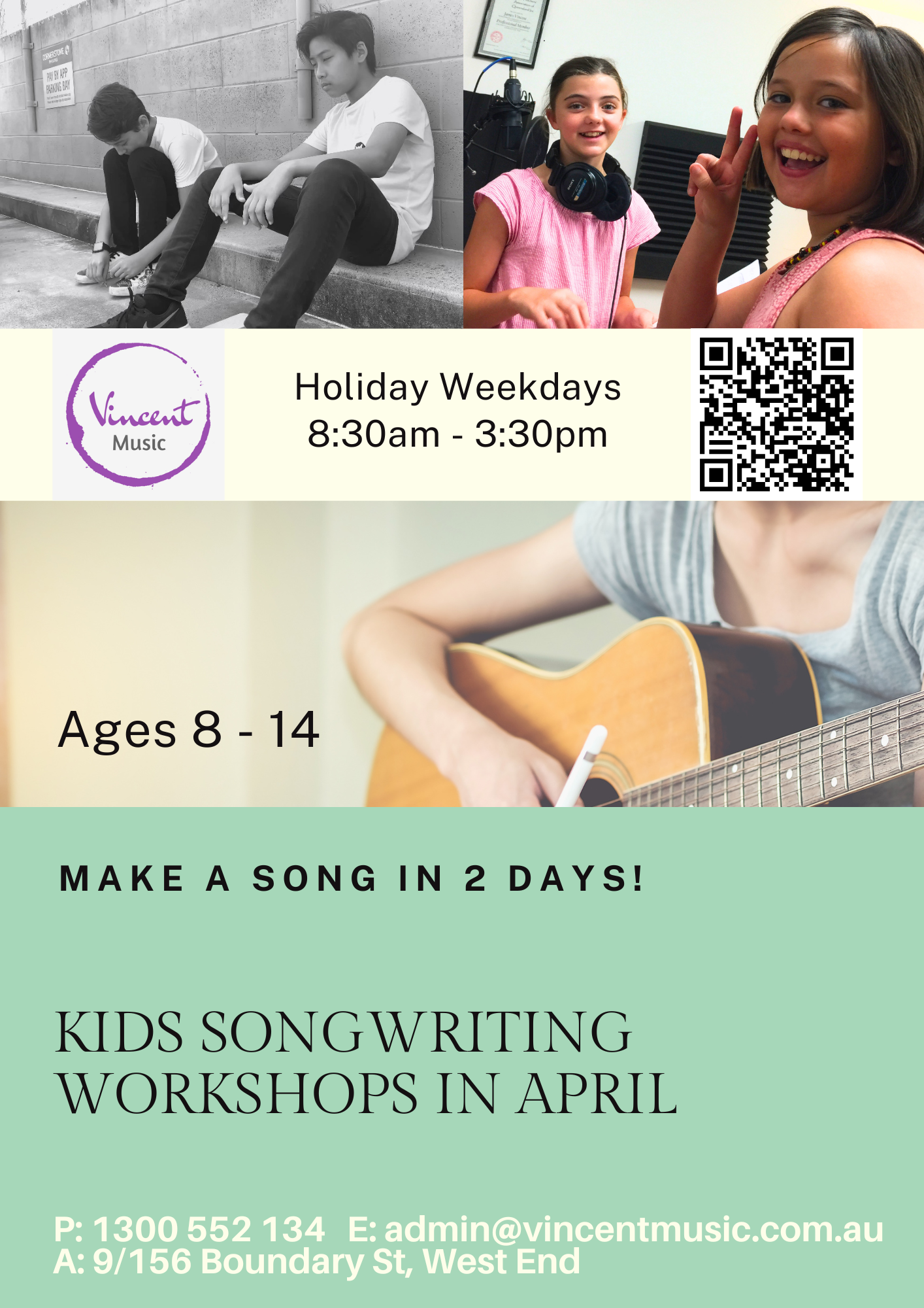 During the holidays, we are holding Songwriting Production Workshops located in West End Brisbane! On completion of this two-day workshop, the participants will receive their fully edited song and videoclip as a YouTube video. They will write, record and film all the material for this across the two days!